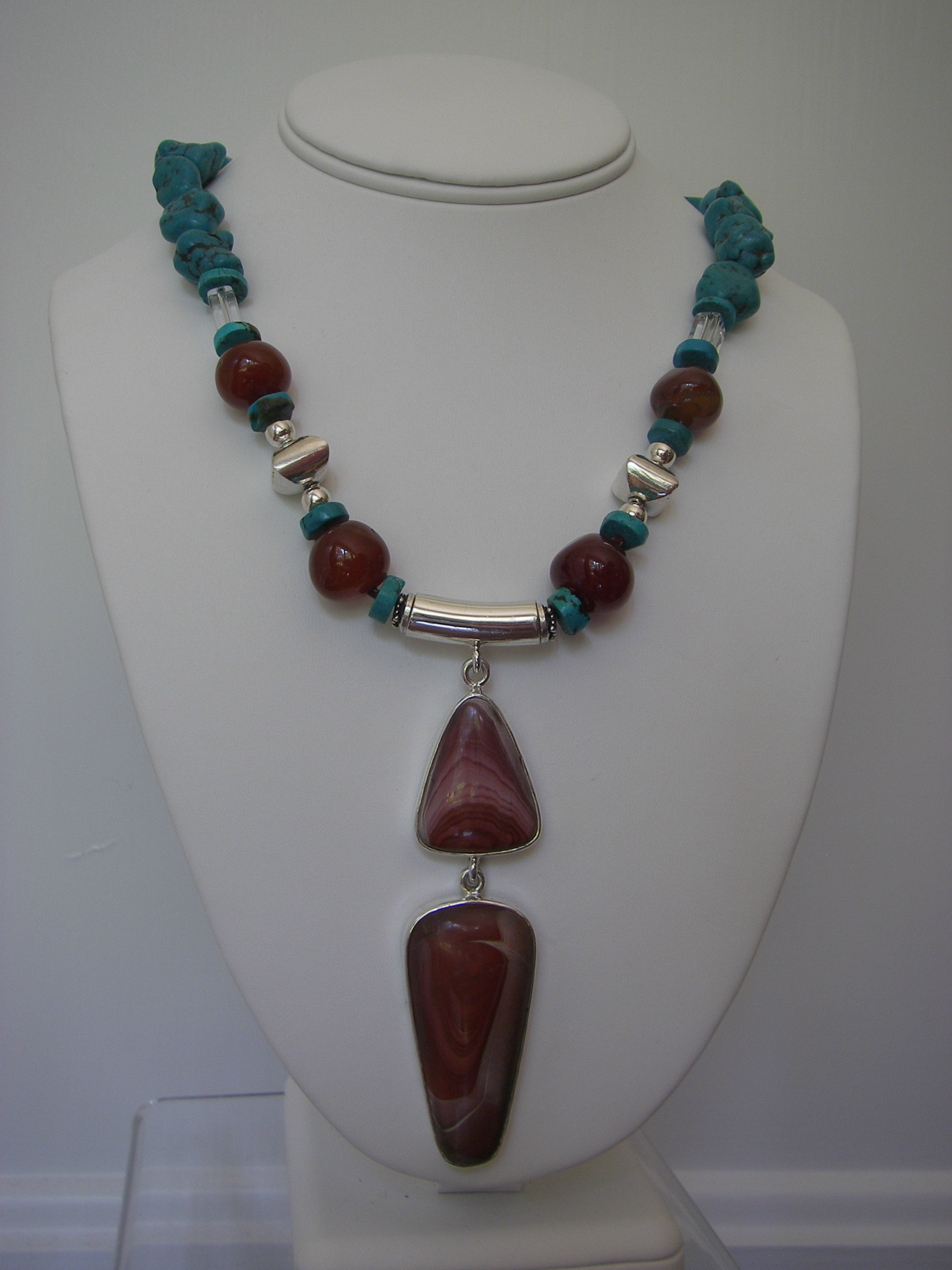 Red jasper sterling double pendent on carnelian with turquoise and sterling silver accents. Expandable sterling toggle.