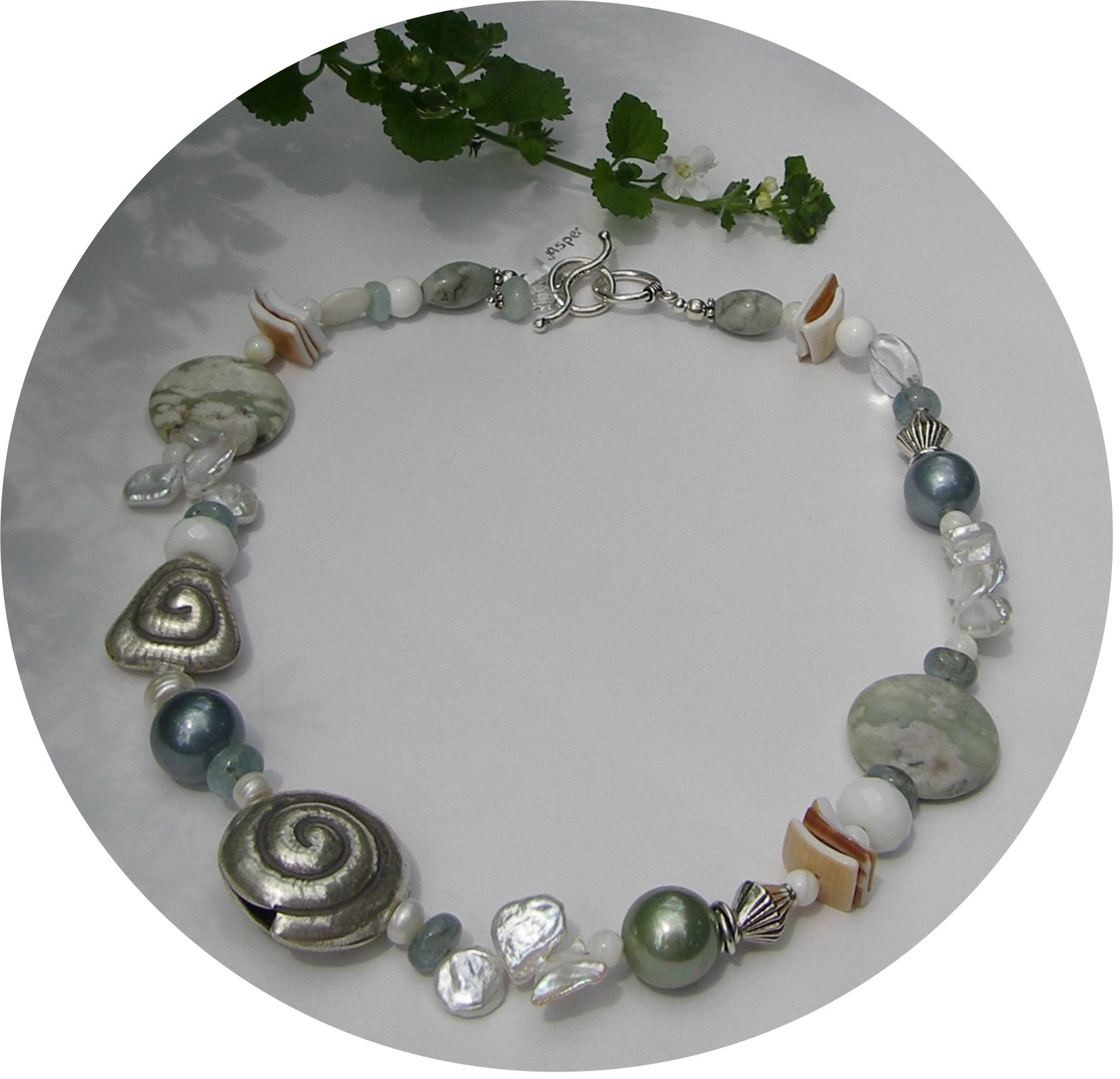 Jasper, rock quartz, pearl, shell and aquamarine with sterling accents create an usual and eye catching necklace. R08